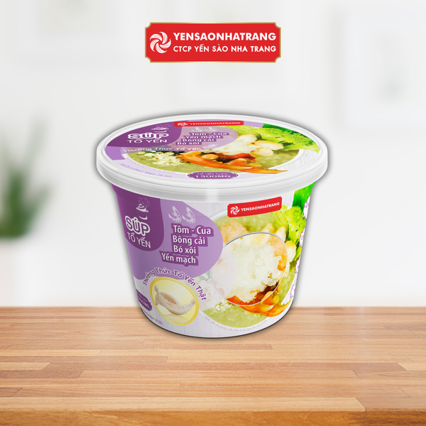 Đây là món súp cao cấp, kết hợp tổ yến giàu protein, axit amin và khoáng chất với tôm, cua, rau xanh và yến mạch, giúp kiểm soát cân nặng hiệu quả. Sản phẩm của CTCP Yến Sào Nha Trang được chế biến bằng công nghệ sấy thăng hoa, giữ nguyên giá trị dinh dưỡng, không chứa chất bảo quản, tiện lợi cho bữa ăn hàng ngày.